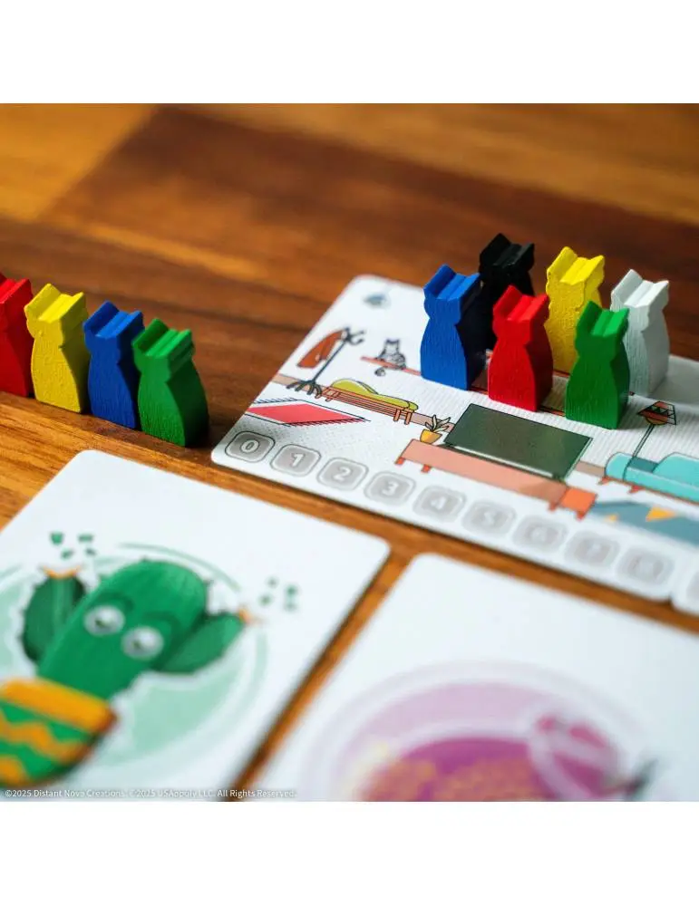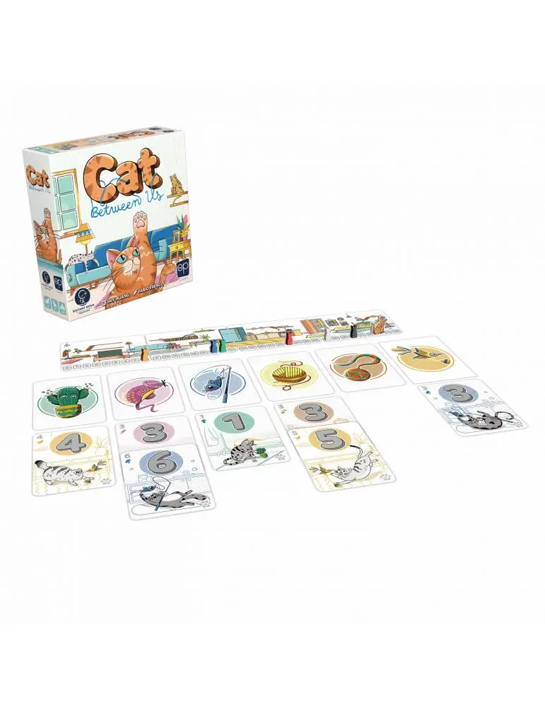 En cada ronda de Cat Between Us, primero robas una carta del mazo y luego colocas la ficha del gato en la casilla numerada del tablero que coincida con el número pequeño de la carta. Baraja el mazo y reparte a todos los jugadores el número de cartas que tengan en la mano.