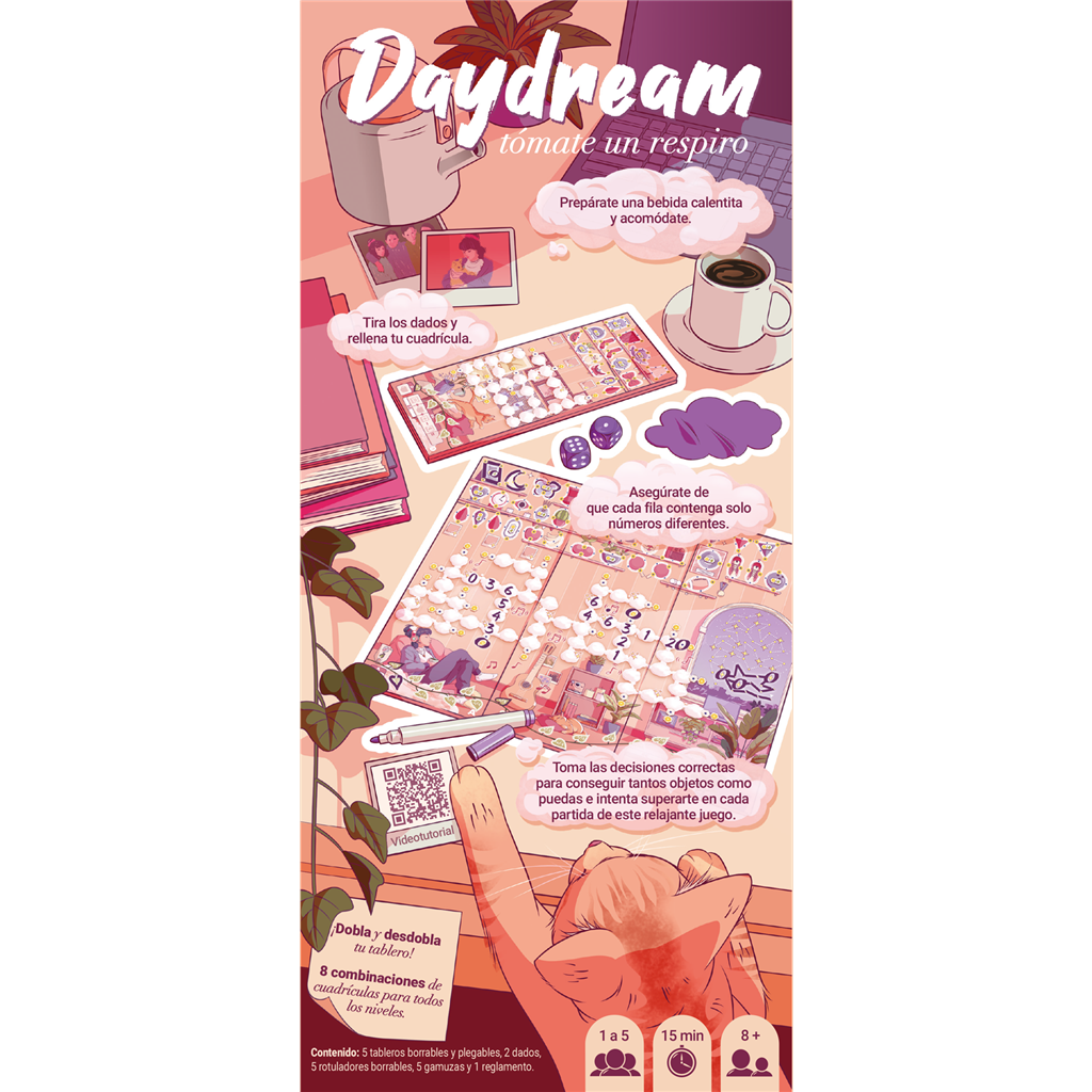 5 tableros borrables y plegables, 2 dados, 5 rotuladores borrables, 5 gamuzas y 1 reglamento.
