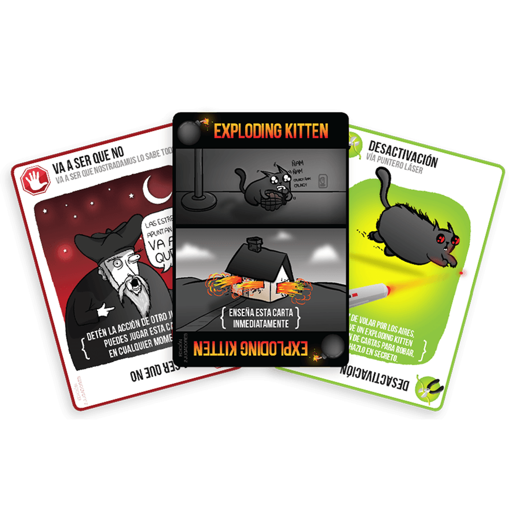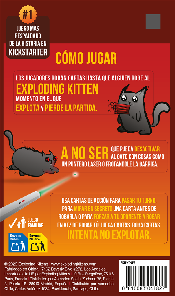 Cómo jugar: los jugadores roban cartas hasta que alguien robe al EXPLODING KITTEN momento en el que EXPLOTA y PIERDE LA PARTIDA. A NO SER que pueda desactivar al gato con cosas como un puntero láser o frotándole la barriga. Usa cartas de acción para pasar tu turno, para mirar en secreto una carta antes de robarla o para forzar a tu oponente a robar en vez de robar tú.