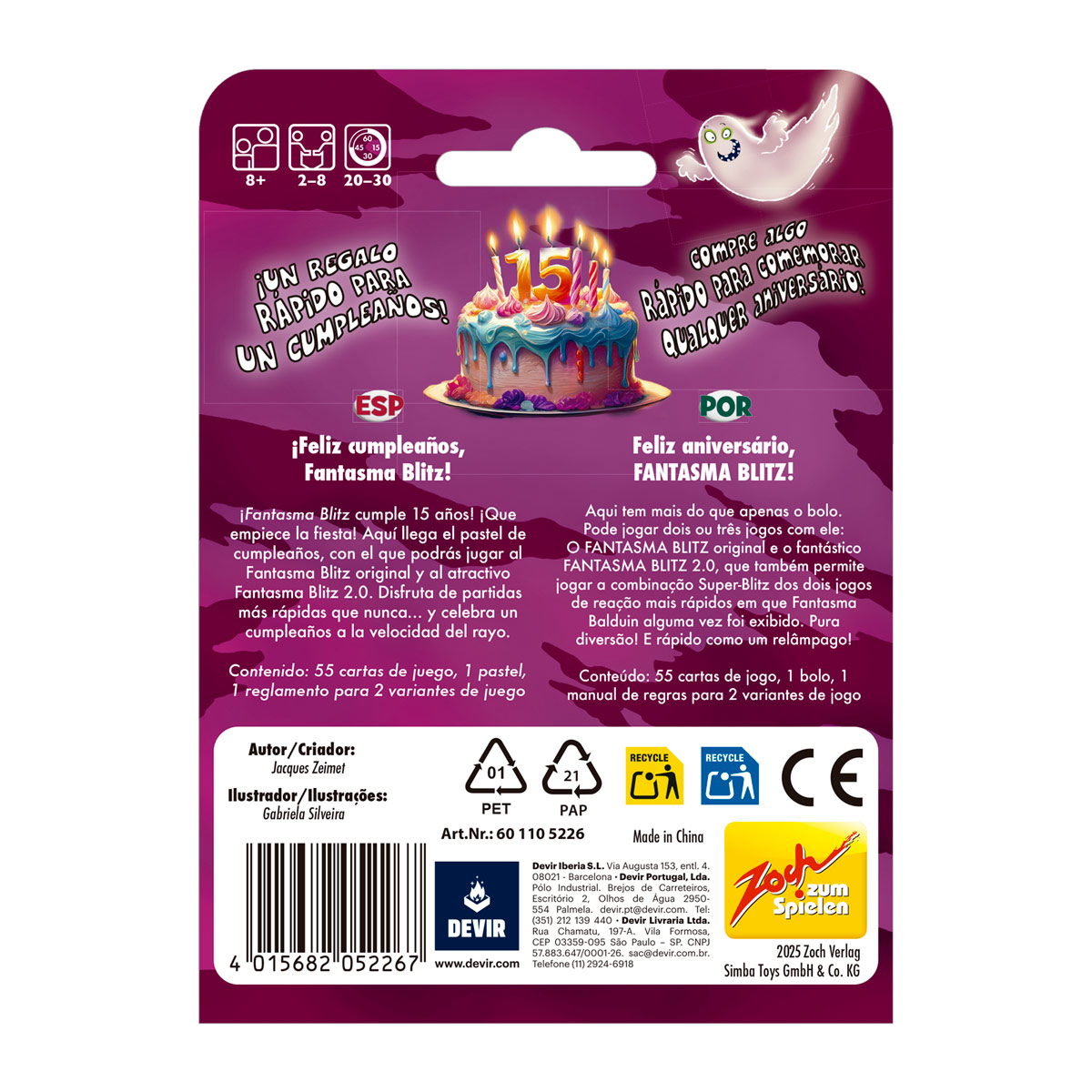 Obra de Jacques Zeimet, Fantasma Blitz ¡Feliz cumpleaños! Se puede disfrutar en pareja o en grupos de hasta 8 jugadores, a partir de 8 años, en sesiones de entre 20 y 30 minutos. El objetivo del juego consiste en ser el más rápido en seleccionar el objeto correcto en función de lo que aparezca en la carta revelada.