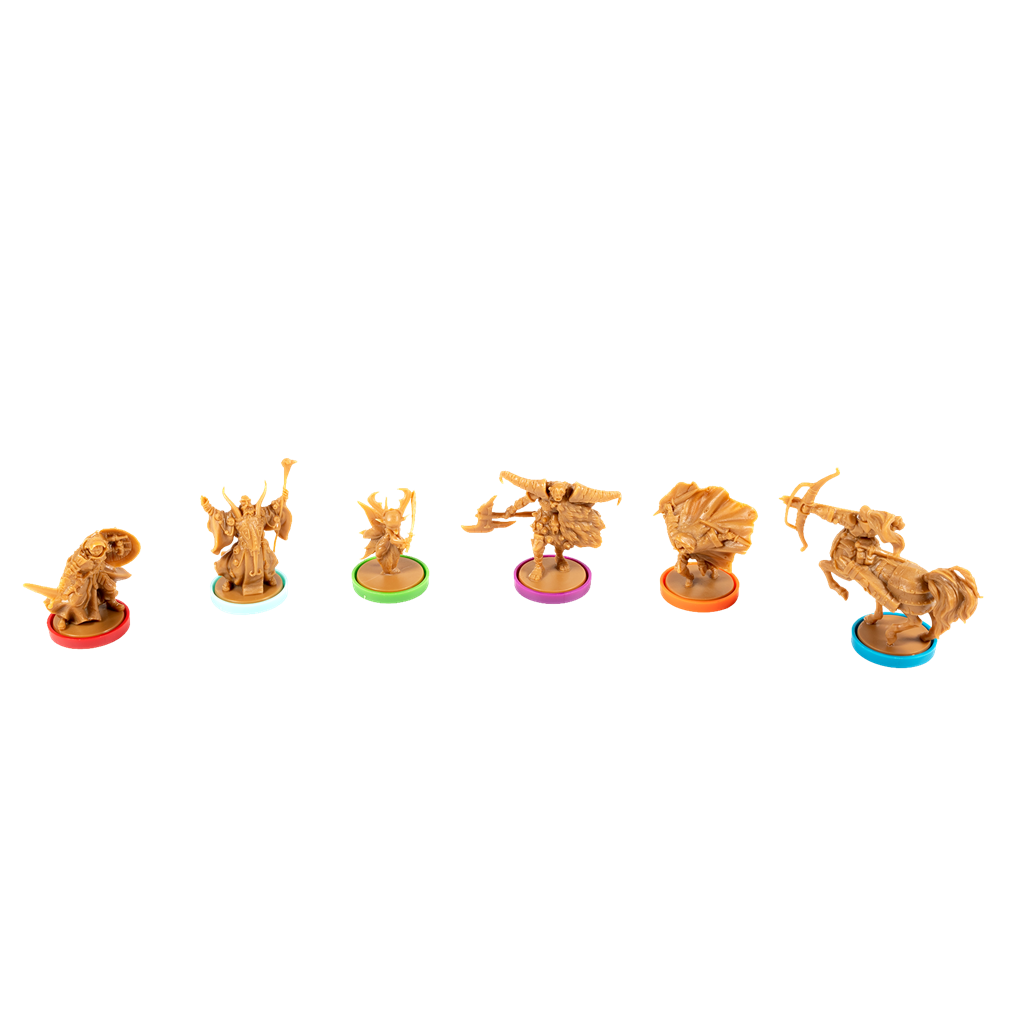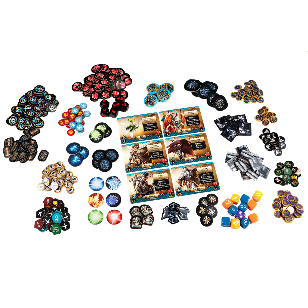 68 Miniaturas de plástico, 18 Dados, 18 marcadores de nivel, 6 Bases de héroe, 6 paneles de héroe, 395 Cartas, 4 paneles de Clase, 2 Bolsas, 1 tablero de oscuridad