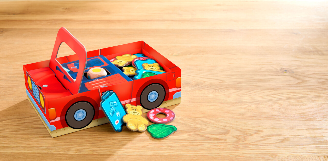 CONTENIDO: 1 base de la caja, 3 separadores, 1 capó, 1 maletero, 1 parabrisas, 16 bultos de equipaje (4 maletas, 4 mochilas, 4 flotadores, 4 ositos de peluche), 1 varilla, 1 dado, 1 instrucciones