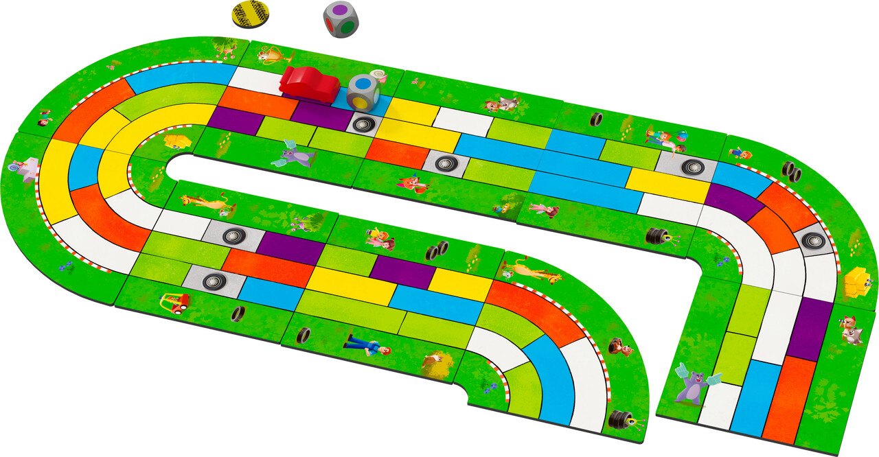 CONTENIDO: 6 coches de carreras, 6 dados de colores, 20 piezas de pista (10 curvas y 10 rectas), 1 casilla de inicio, 1 casilla de meta, 48 fichas de cartón (36 fichas de acelaración en 6 colores, 6 fichas de tirada adicional, 6 fichas de trofeo, 1 ficha de inicio), 1 instrucciones del juego.