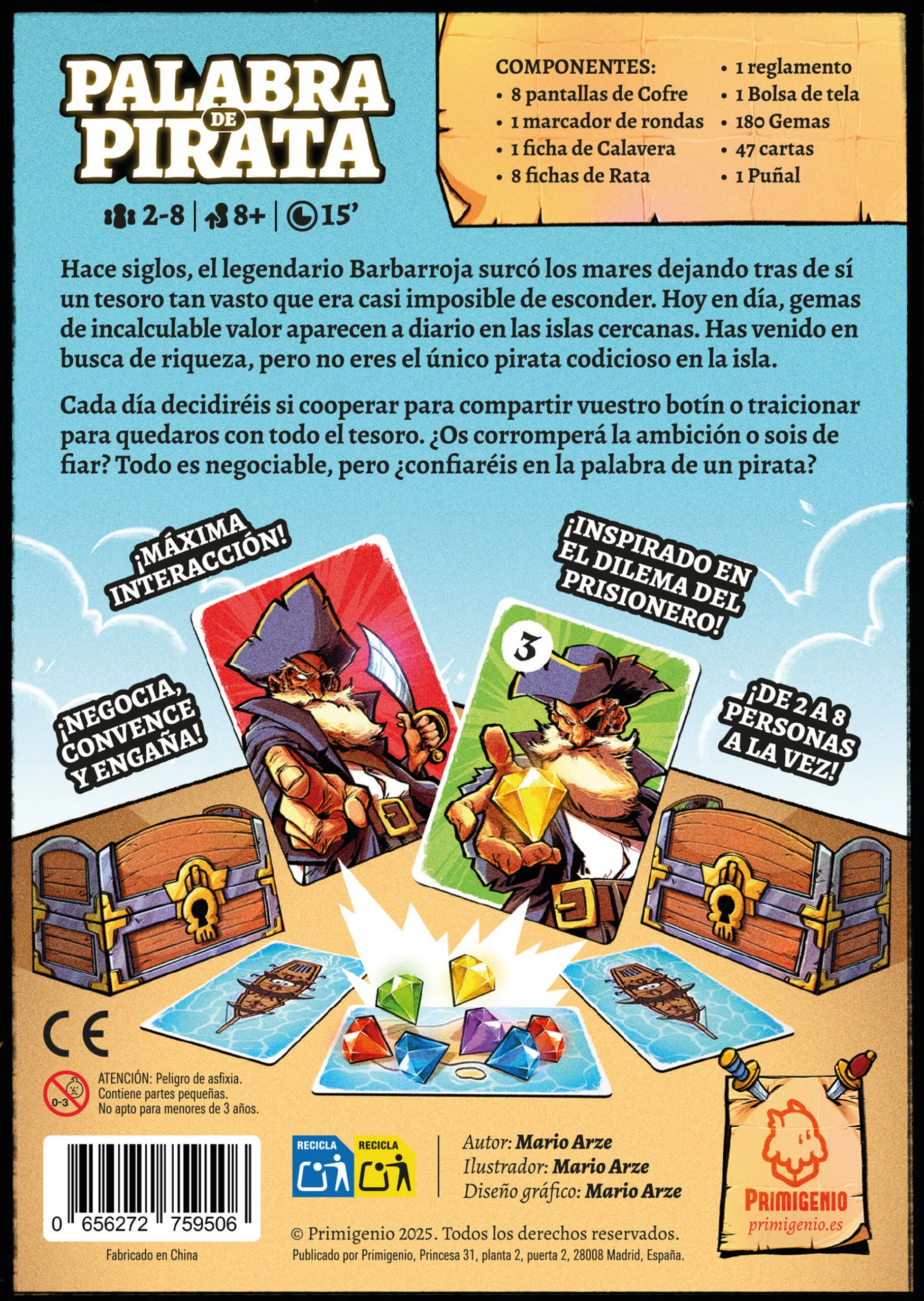 La partida dura cinco días. Cada día, se colocan nuevas gemas en las islas, que se sitúan entre cada par de jugadores. Cada uno tiene 3 cartas en mano: 2 verdes (de cooperación) y 1 roja (de traición). En secreto, elegirás una carta para colocar boca abajo en la isla a tu izquierda y otra en la isla a tu derecha.