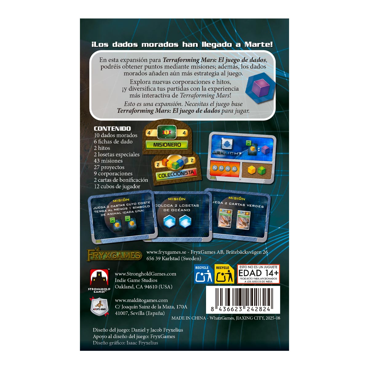 En esta expansión para Terraforming Mars: El juego de dados, podréis obtener puntos mediante misiones; además, los dados morados añaden aún más estrategia al juego.